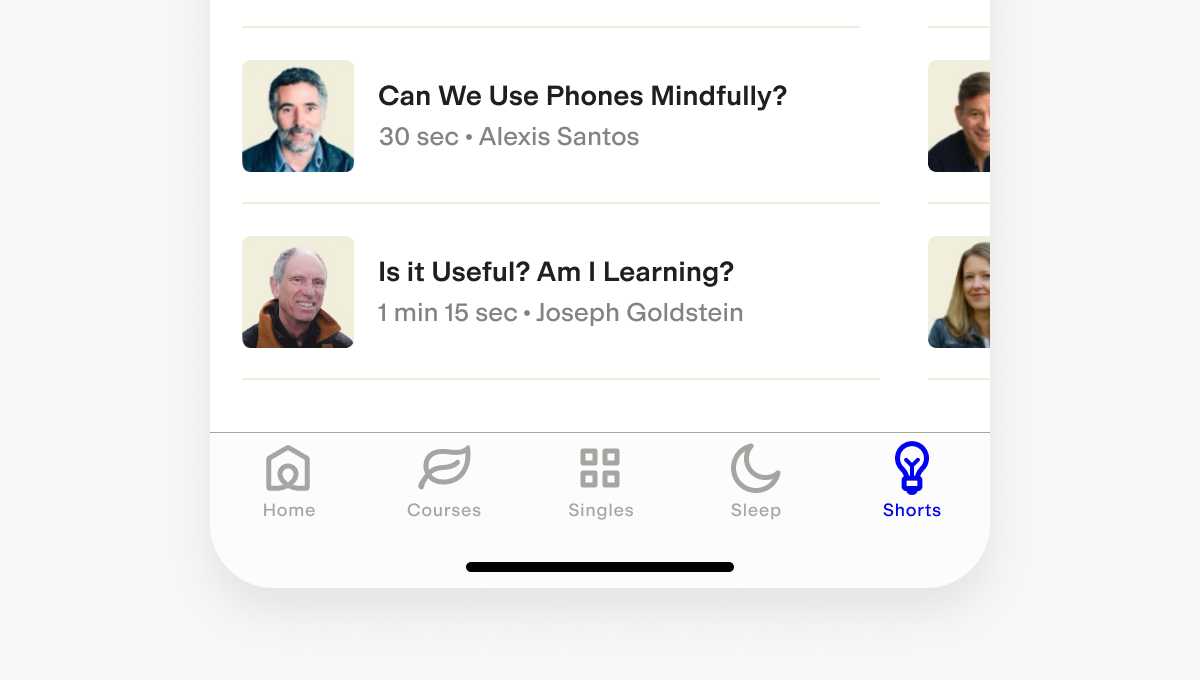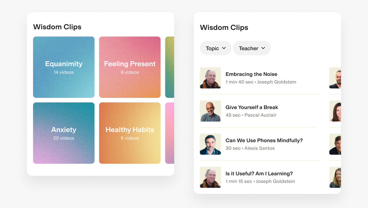 Wisdom clips are short clips taken from longer course videos. For our V1 launch, we opted to reuse our existing patterns by grouping these into cards, identical to our meditation library, and ordered them based on popularity.