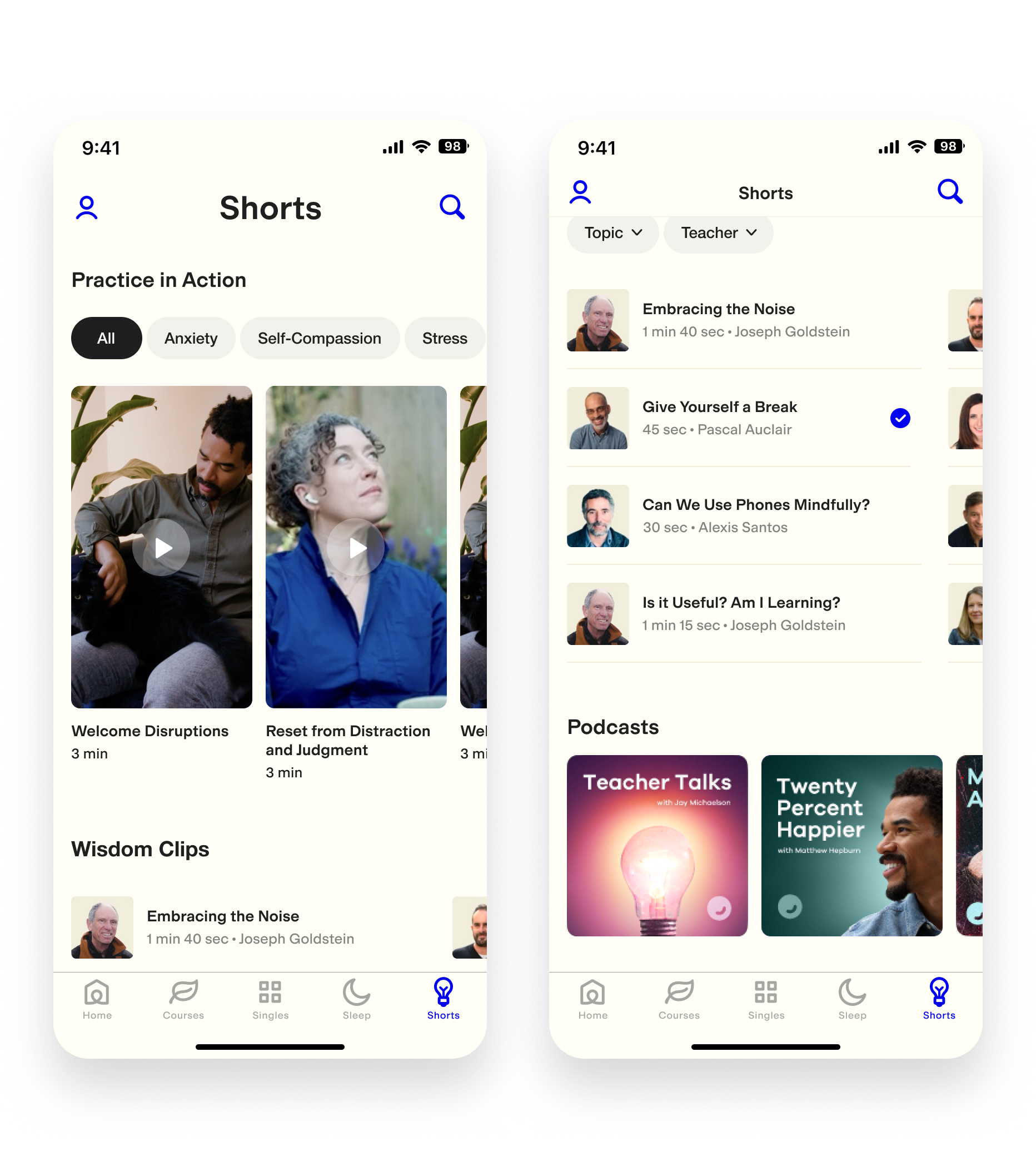 For V2, we pulled these out and added a filtering feature to make them even easier to access. Now users will be able to quickly see all the wisdom clips from their favorite teacher on their topic of choice.