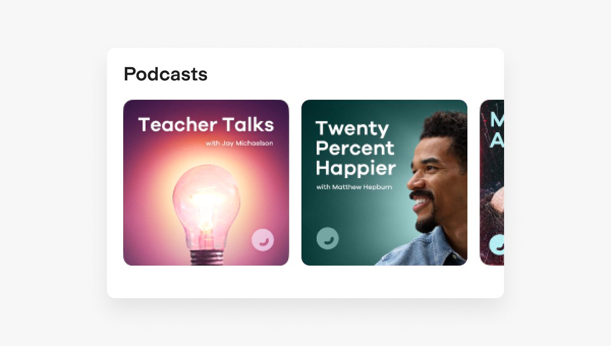 As part of a contract negotiation, we needed to remove the Ten Percent Happier podcast from the Happier Meditation app. Rather then simply remove the podcast, we wanted to use the opportunity to reimagine this tab as a hub for all our short-form content, improving it’s usefulness and evolving it into a retention tool.